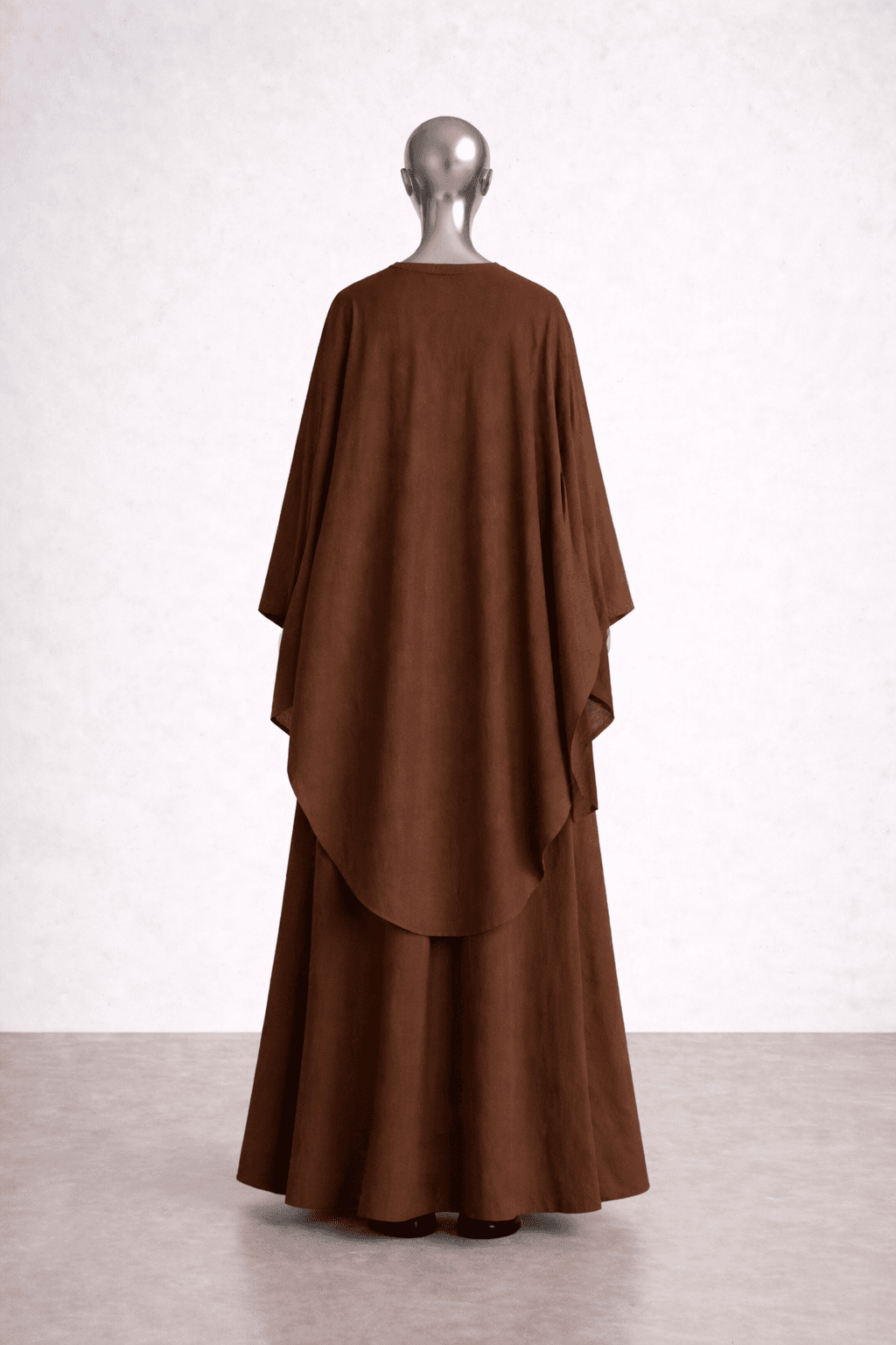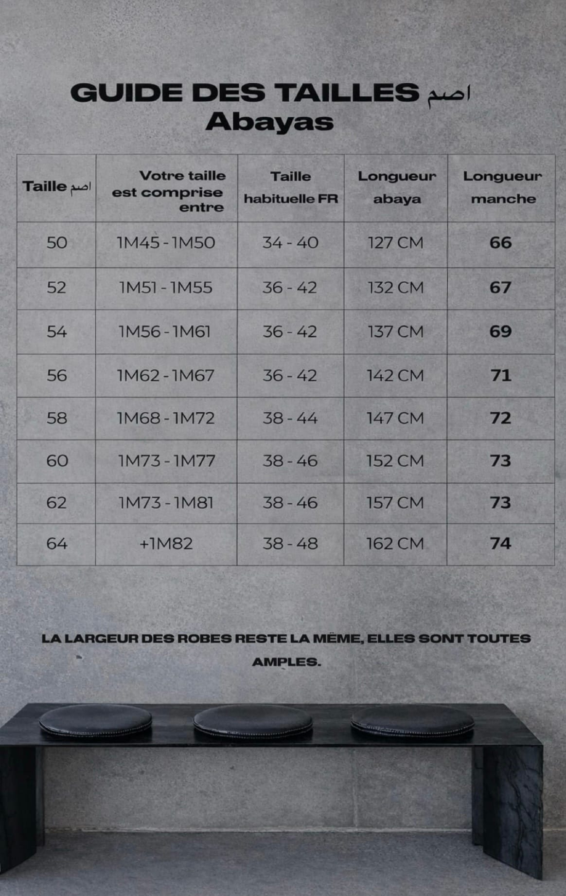 La robe est évasée pour ne pas marquer les formes. Les manches couvrent sans gêner les mouvements. Un élastique est installé à l’intérieur pour éviter de découvrir les avant-bras.