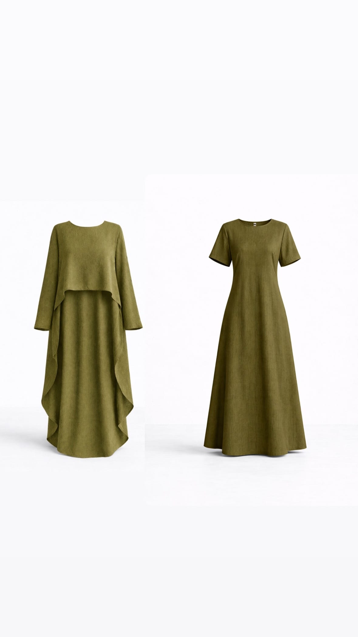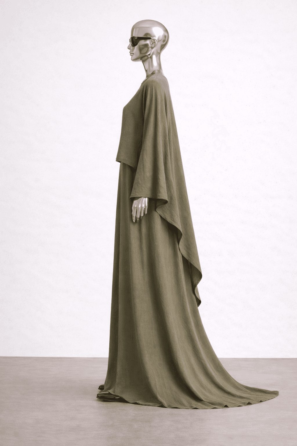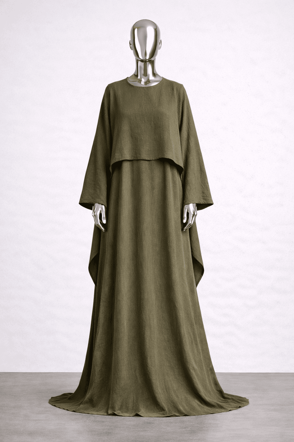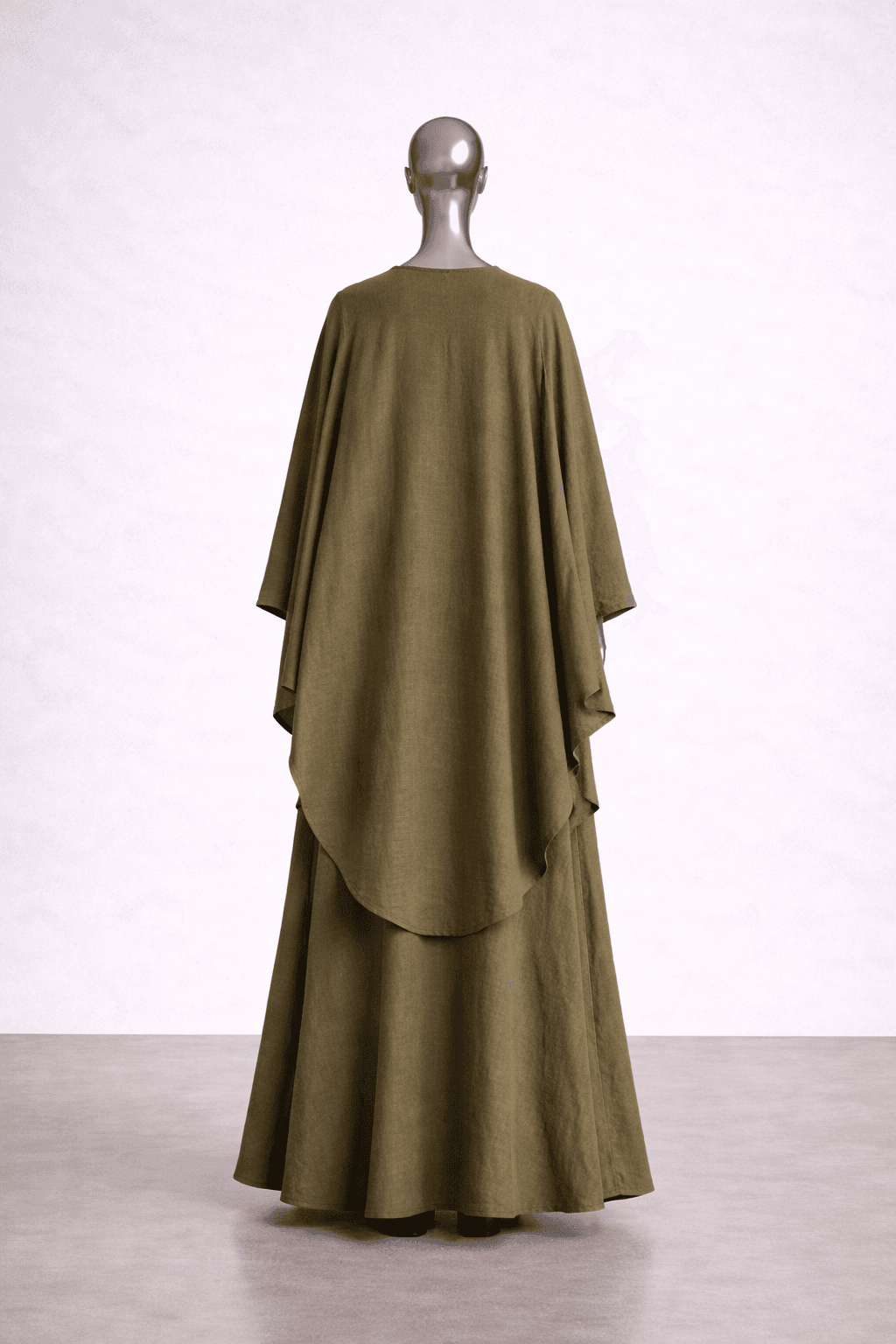 Ce set deux pièces en coton olive a été conçu pour créer une posture celle de la femme pudique et à l’aise dans son vêtement. Une robe longue fluide, simple en apparence, associée à un haut asymétrique qui vient structurer l’ensemble avec subtilité, une couche supplémentaire pour effacer les atours féminin.